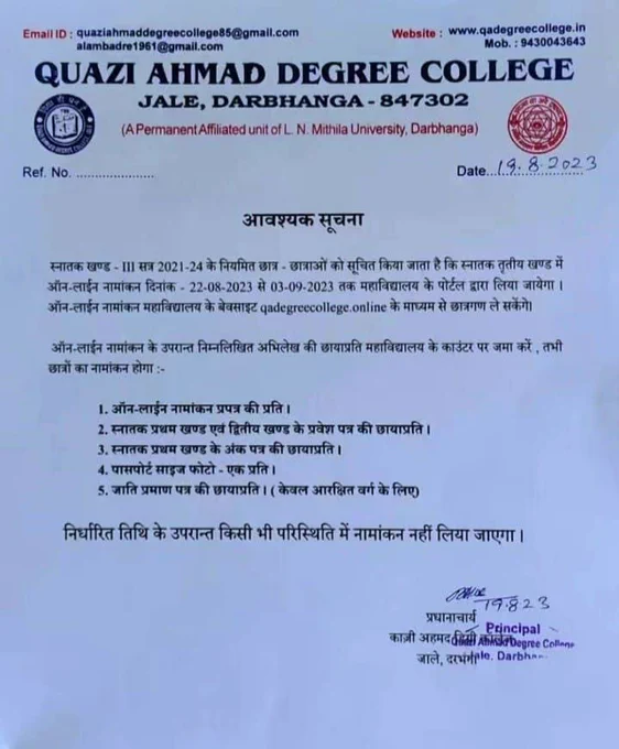 Quazi Ahmad Degree College Jale Darbhanga BA / BSc / BCom (UG) Under Graduation 2021-2024 |