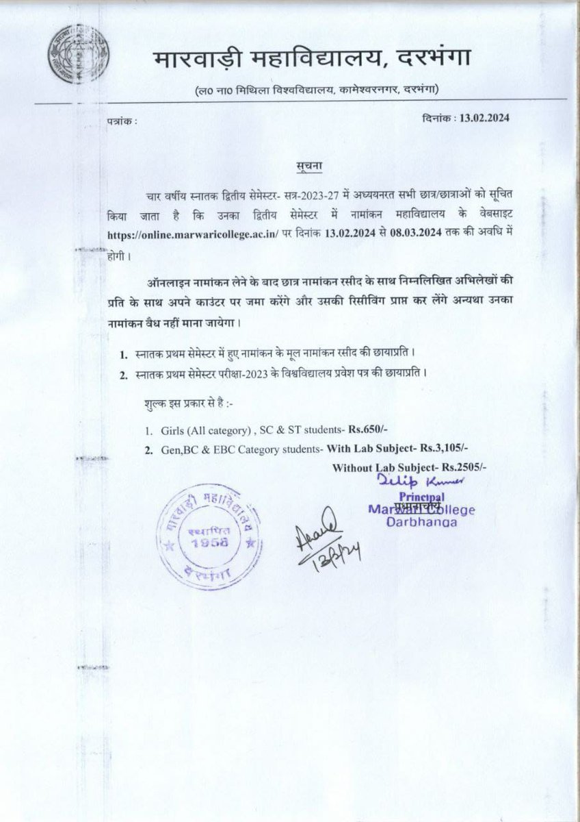 Marwari College, Darbhanga, Bihar BA / BSc /B.Com (UG) Marwari College UG Admission 2024 |