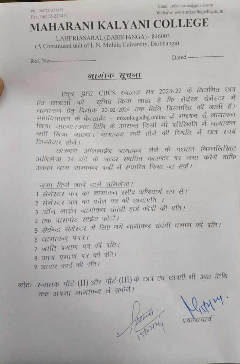 MK College Darbhanga Degree 2nd Semester (2023-27) Admission Notice:- All the students of Bachelor of Four Year Arts Commerce and Science (Reputation) C.B.C.S. 2nd Semester Session 2023-27 are informed that they can register themselves online. Get it done through.